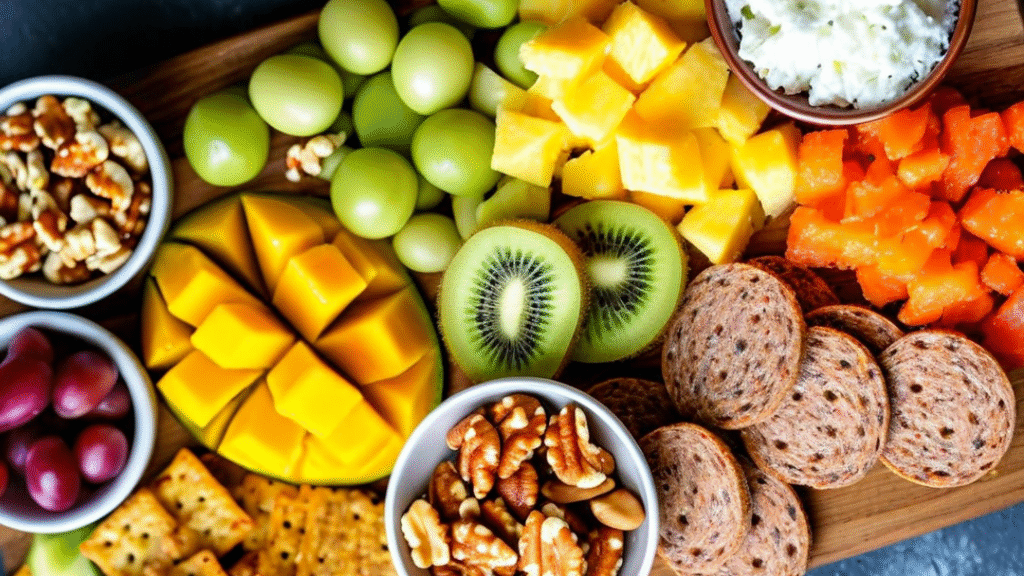For a balanced meal, include some protein like boiled eggs or ham, and scattered fresh apple slices for a sweet contrast. The key is to keep everything organised yet inviting, encouraging everyone to pick and choose as they like.