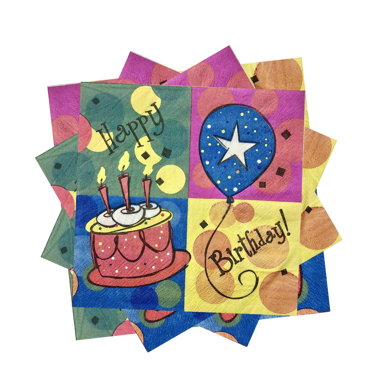 These 2 ply napkins feature a colourful birthday-themed design with balloons, cake, and playful text. Each quadrant presents a vibrant scene, making them ideal for birthday celebrations and parties.