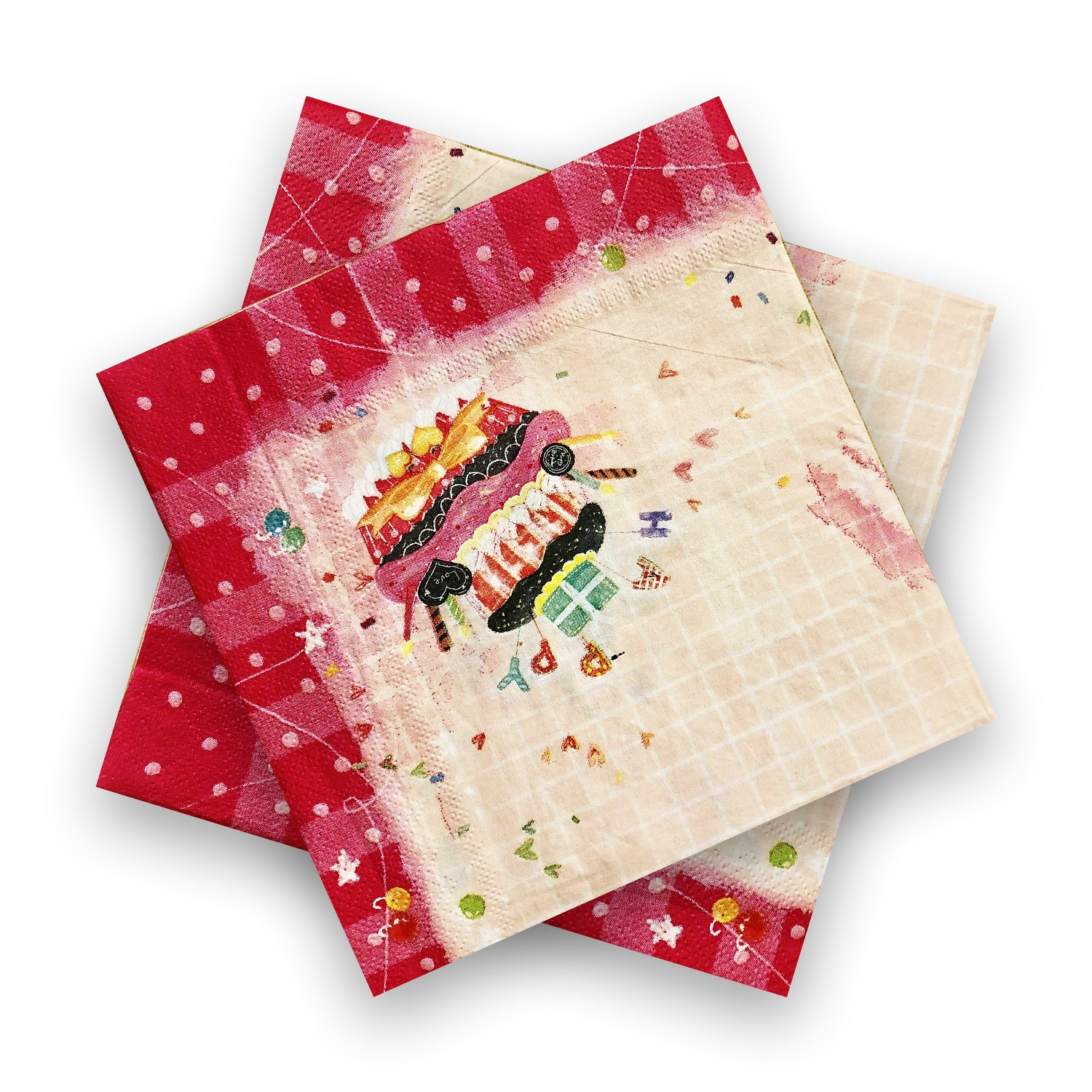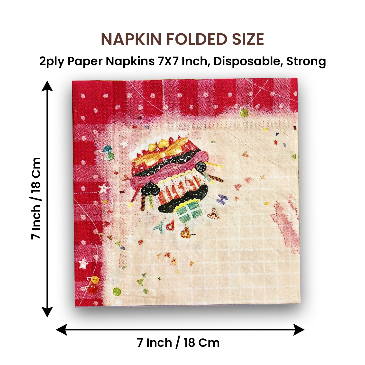 Each napkin showcases a multi-layered pink birthday cake, surrounded by playful patterns and vibrant borders. These paper dinner napkins are ideal for birthdays, anniversaries, and festive events, adding flair to every table.