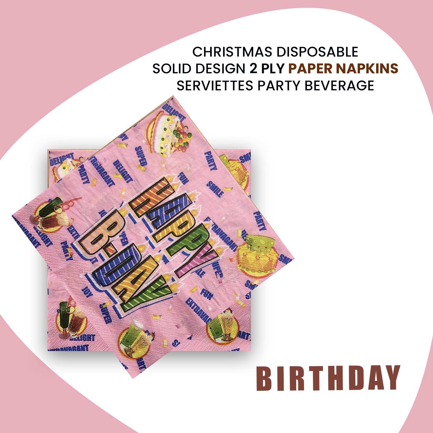 Add a festive touch to your birthday celebrations with these vibrant pink disposable napkins, featuring colourful candle-style lettering, playful cake slices, and celebratory icons for an engaging table display.