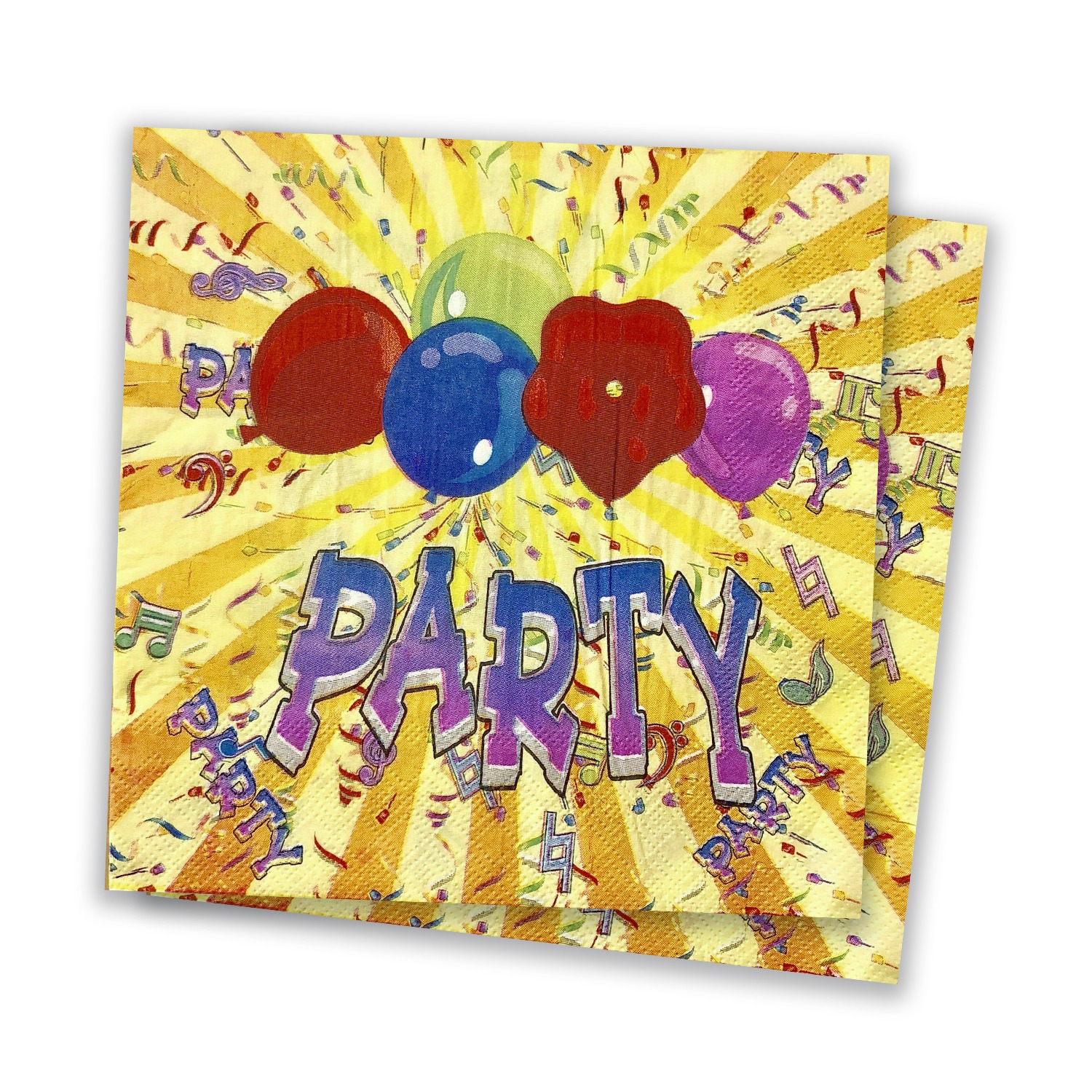 These yellow paper napkin serviettes bring energy and cheer to any celebration. Featuring a vibrant yellow background with sunburst patterns, colourful balloons, and playful confetti, they instantly brighten any table setting.