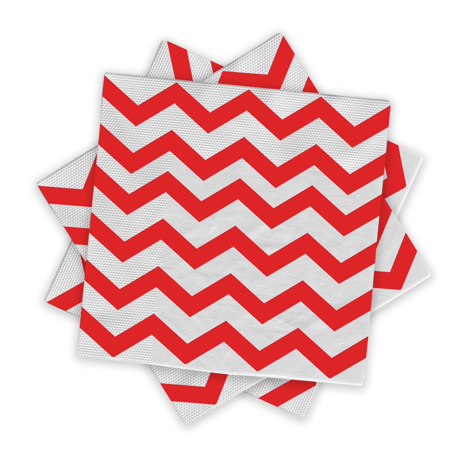 The napkins feature a striking red and white zigzag pattern. Measuring 7 x 7 inches (18 x 18 cm), they offer a perfect balance of size and usability. The crinkled centre and embossed border elevate the red napkin paper to a premium table accessory.