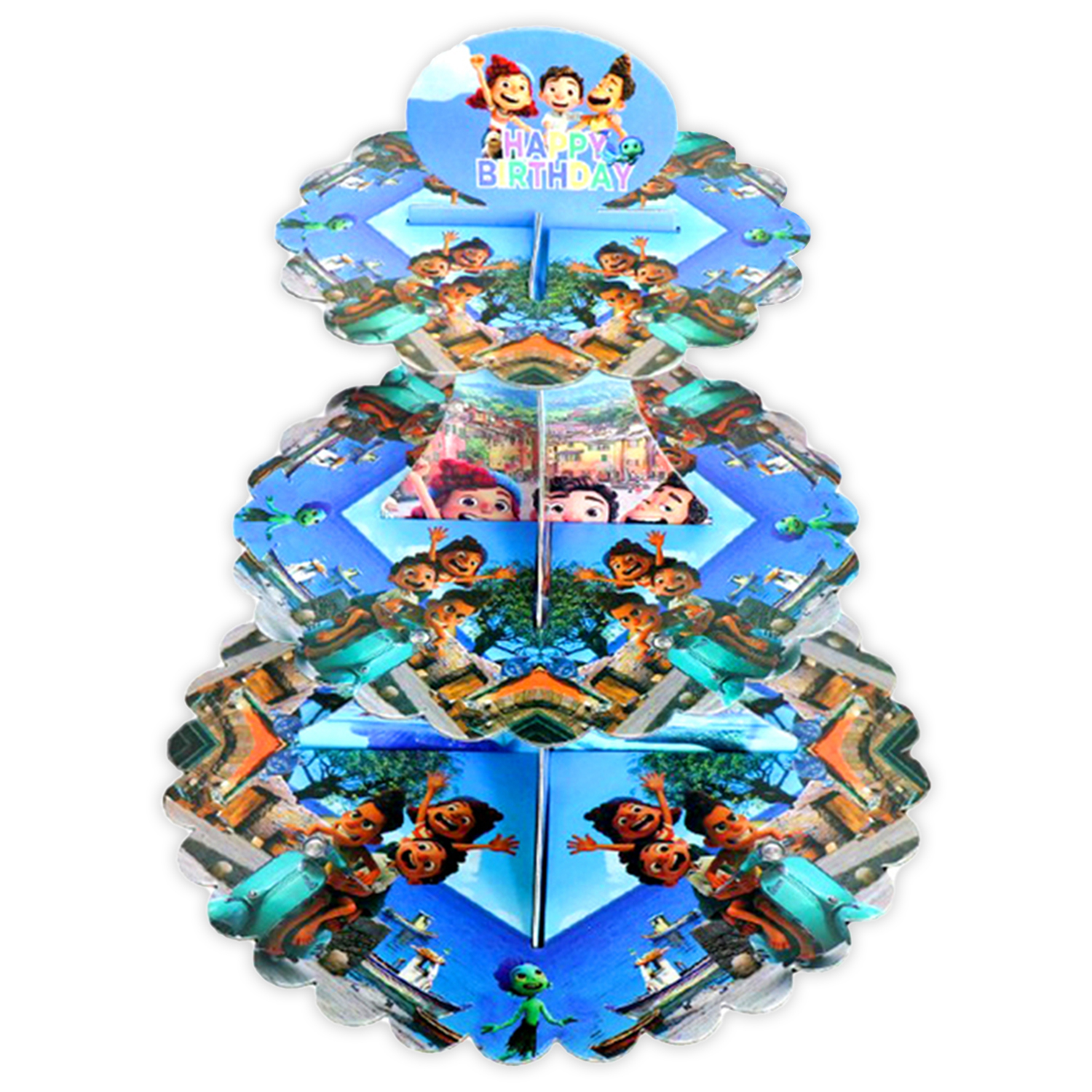 The 3 tier stand for cupcakes is decorated with beloved characters Luca, Alberto, and Giulia. Its bright blue and turquoise palette, with playful illustrations, adds joy to any event.