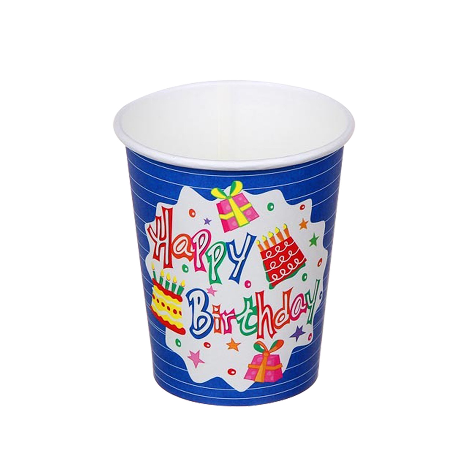 The cups paper design features colorful illustrations of balloons, cake, gifts, and confetti. The vibrant print makes these cups personalised for birthday celebrations, adding a cheerful and decorative touch to tables.