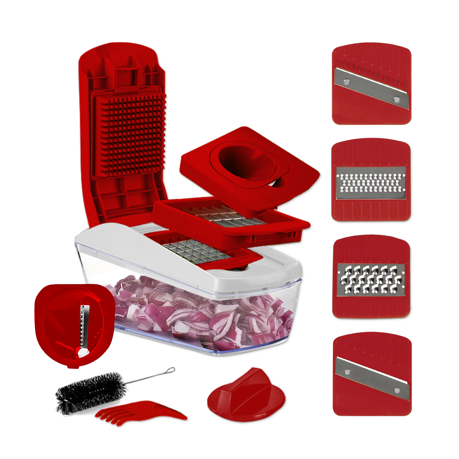 This vegetable chopper is built with an ergonomic lid and safety accessories. The included hand guard and cleaning brush keep your fingers safe while ensuring blades remain hygienic.
