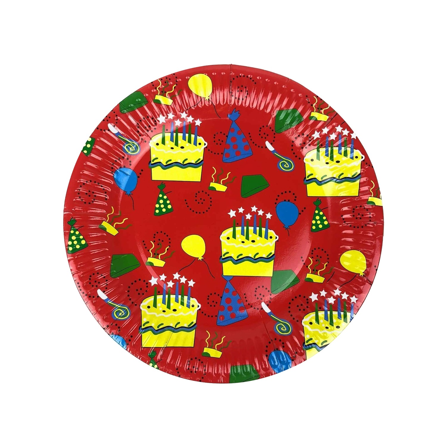 Celebrate in style with paper plates red featuring a colourful three-tiered birthday cake, balloons, streamers, and confetti. These red plates paper instantly create a lively and cheerful party atmosphere.