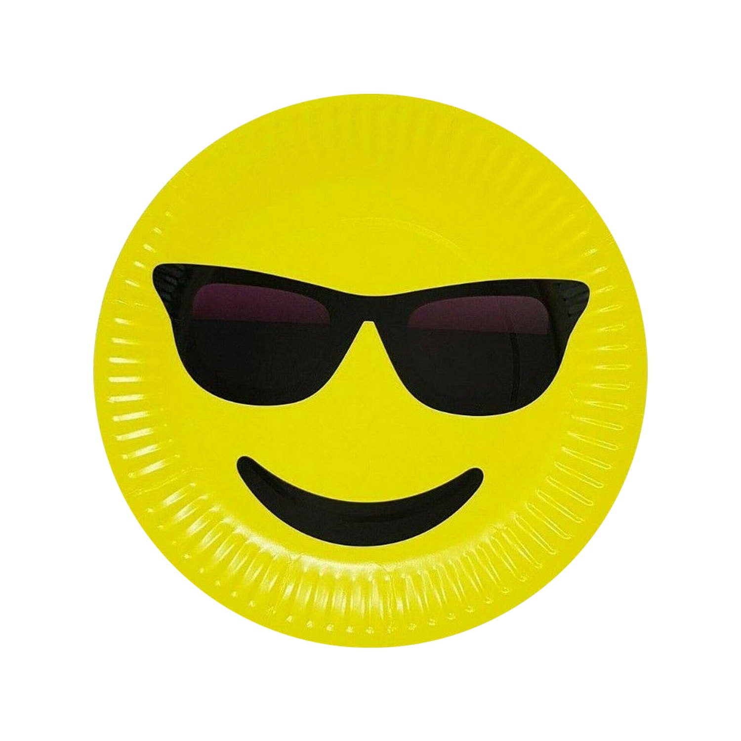 Each paper party plates features a vibrant yellow emoji wearing black sunglasses, smiling widely, with “Happy Birthday” text. The cheerful design ensures these paper plates for snacks delight guests of all ages.