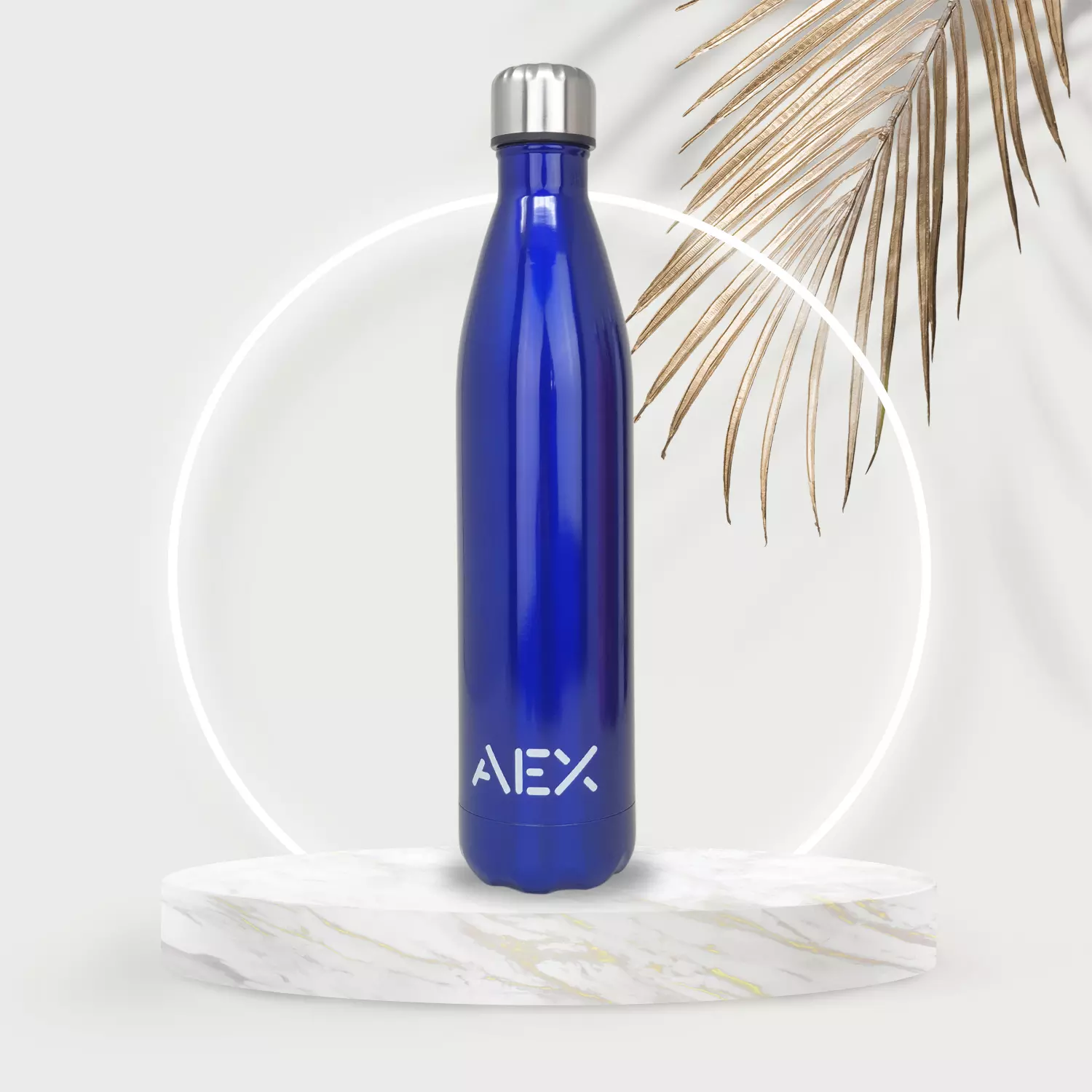 This water bottle stainless steel comes in two striking blue finishes: a glossy vibrant blue and a subtle matte navy. The vertical white AEX logo adds a crisp, modern touch to its elegant appearance.